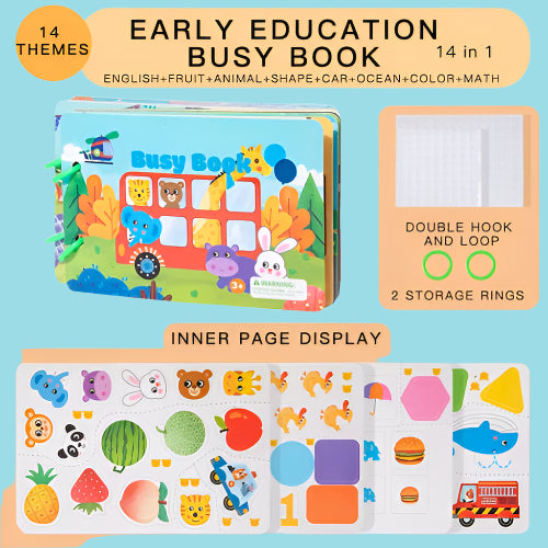 This colorful busy book is designed to spark creativity and focus. With reusable sticker pages full of animals, numbers, and playful scenes, it encourages hands-on learning while keeping little minds and hands engaged.